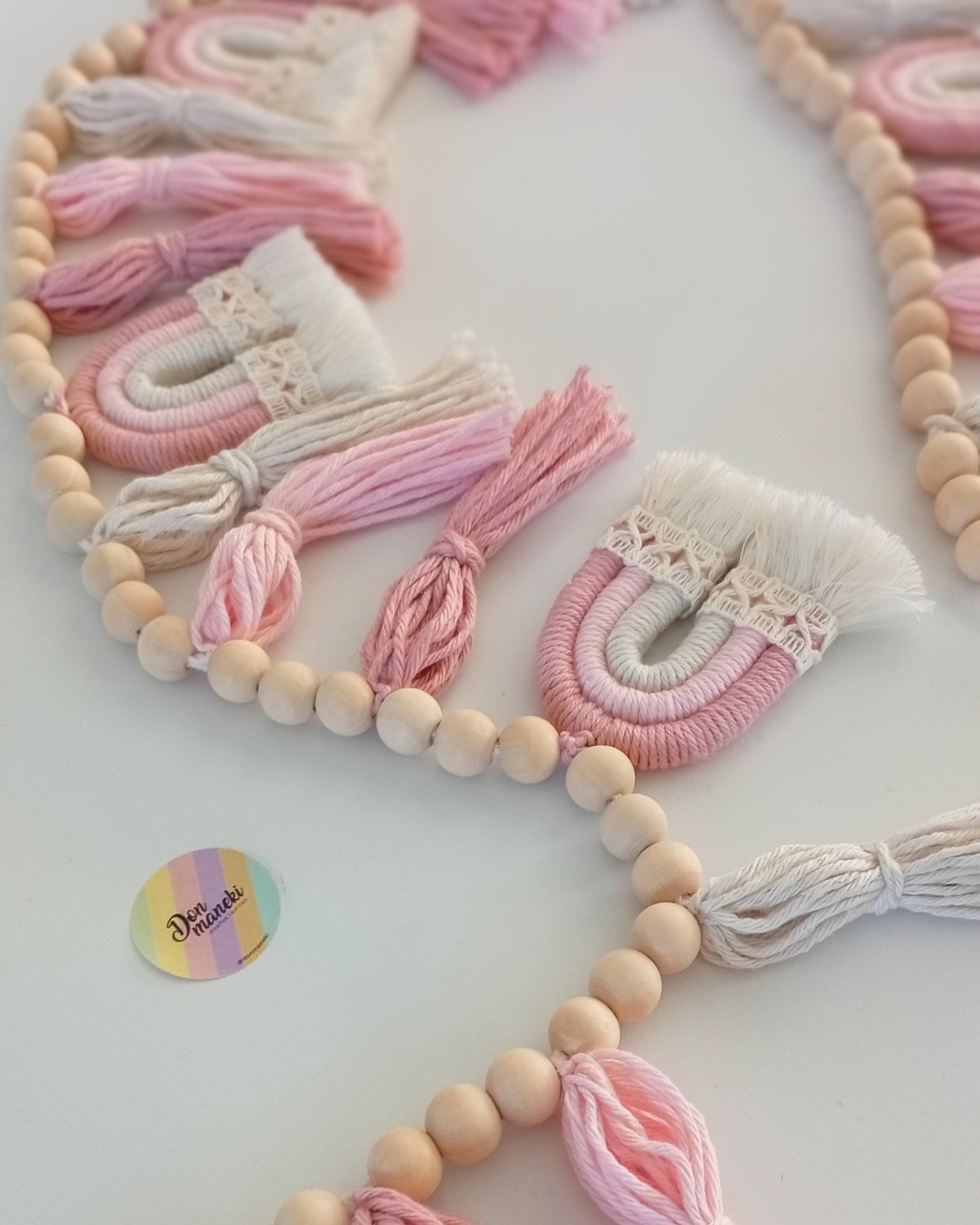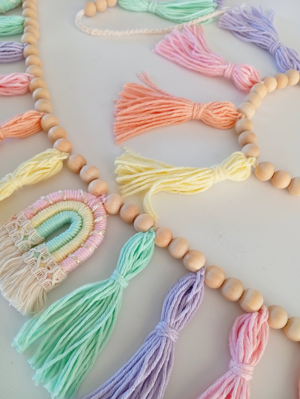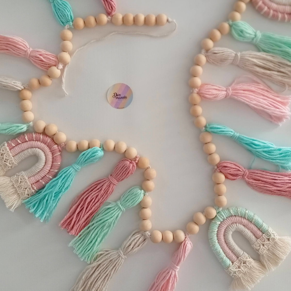 Guirnalda confeccionada con borlas de hilo de algodón, cuencas de madera y arcoiris de 3 arcos.